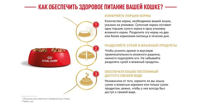 Для удовлетворения индивидуальных предпочтений каждого животного ROYAL CANIN® Maine Coon Adult выпускается также в форме влажного продукта в виде кусочков в соусе. Если Вы выбрали для своей кошки смешанное питание, следуйте рекомендованным нормам кормления, чтобы сочетать сухой и влажный продукт в пропорциях, оптимальных для здоровья животного.