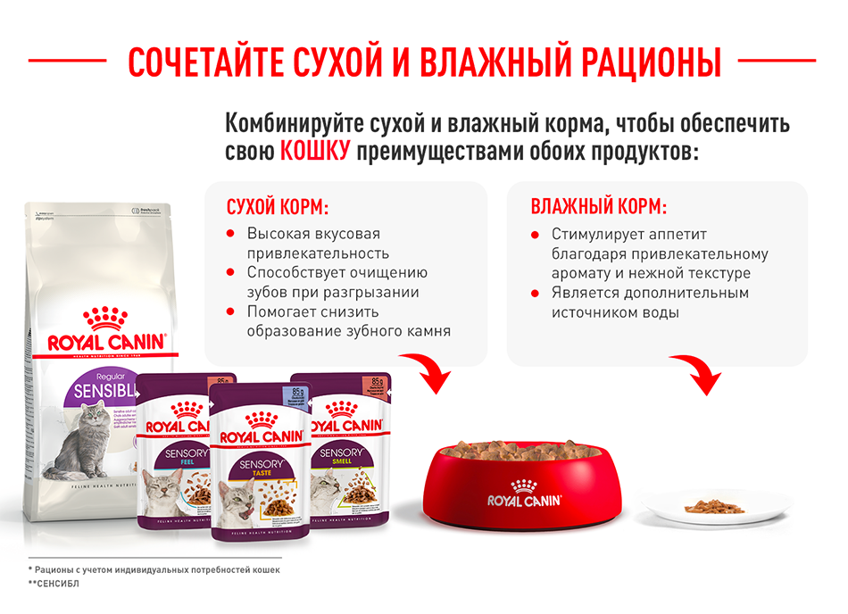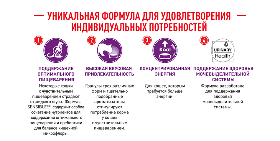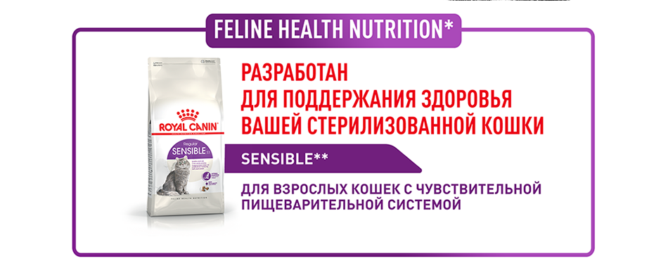 Кроме того, ROYAL CANIN® Sensible 33 поддерживает здоровье мочевыделительной системы взрослой кошки. Кошку можно продолжать кормить ROYAL CANIN® Sensible 33 и после того, как ее пищеварение нормализуется: продукт не только стабилизирует работу ЖКТ, но и поддерживает здоровье пищеварительной системы в дальнейшем.
