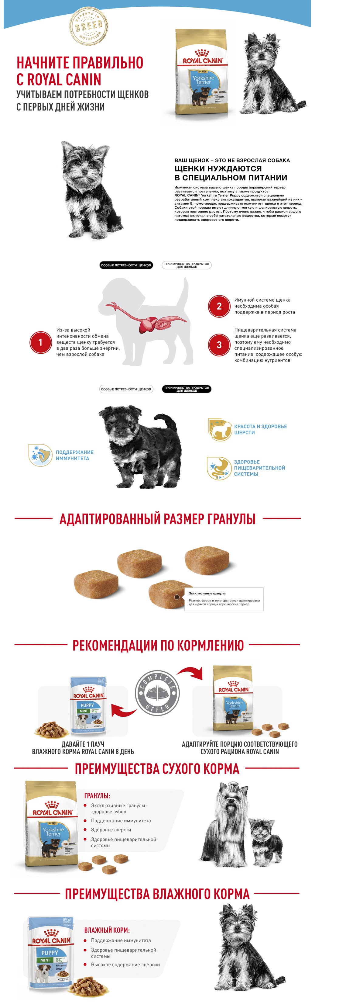 Йоркширский терьер Паппи: ROYAL CANIN® Yorkshire Terrier, предназначенный для щенков собаки породы йоркширский терьер в возрасте до 10 месяцев, специально разработан с учетом потребностей вашей собаки в питательных веществах. ROYAL CANIN® Yorkshire Terrier обогащен жирными кислотами Омега-3 (ЭПК и ДГК) и Омега-6 (содержащимися в масле огуречника аптечного), а также биотином для поддержания здоровья кожи и блеска шерсти вашего щенка.