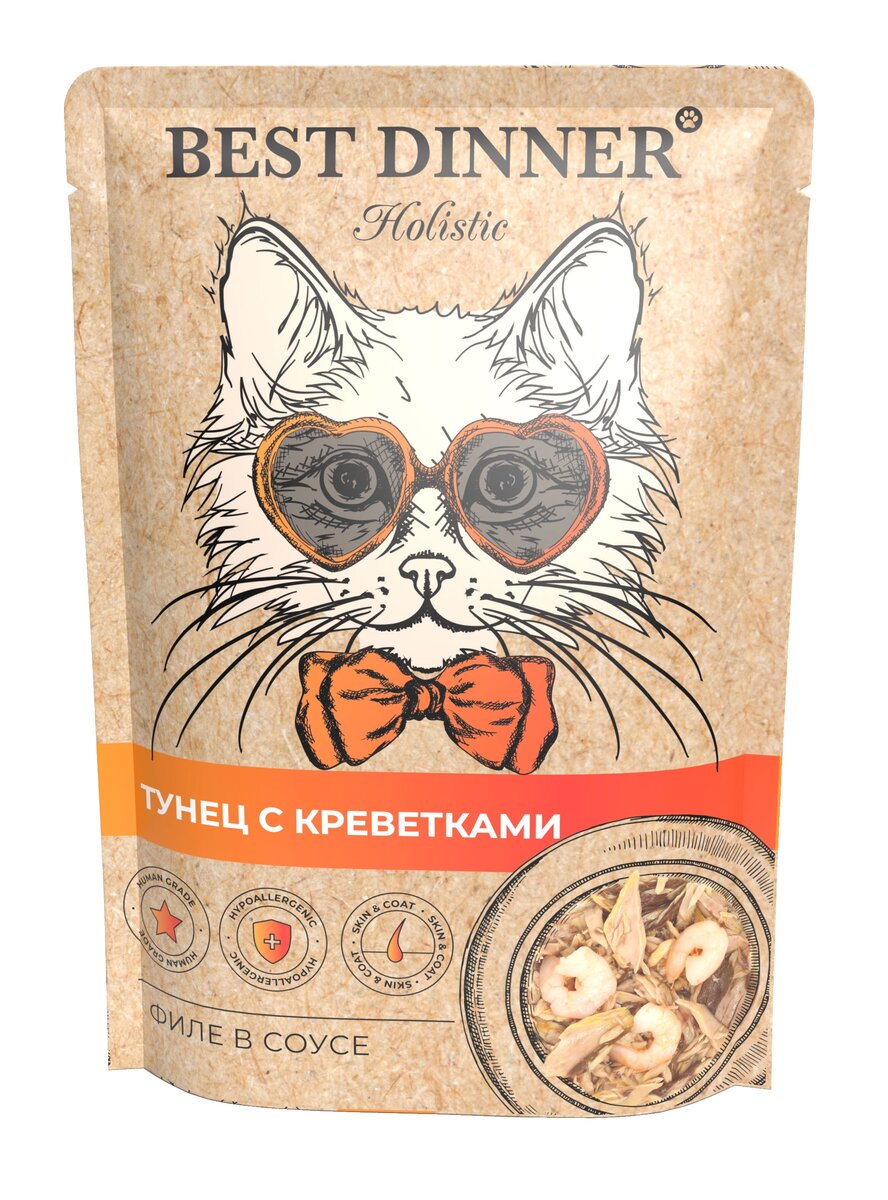HOLISTIC Полнорационный влажный консервированный корм. Best Dinner Филе "Тунец с креветками" для взрослых кошек.